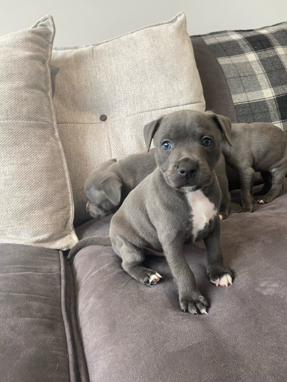 Beautiful litter of Kc registered blue Staffordshire bull terriers 1boy available looking for there forever homes. both damn and Shire are very friendly family pets with great blood lines.